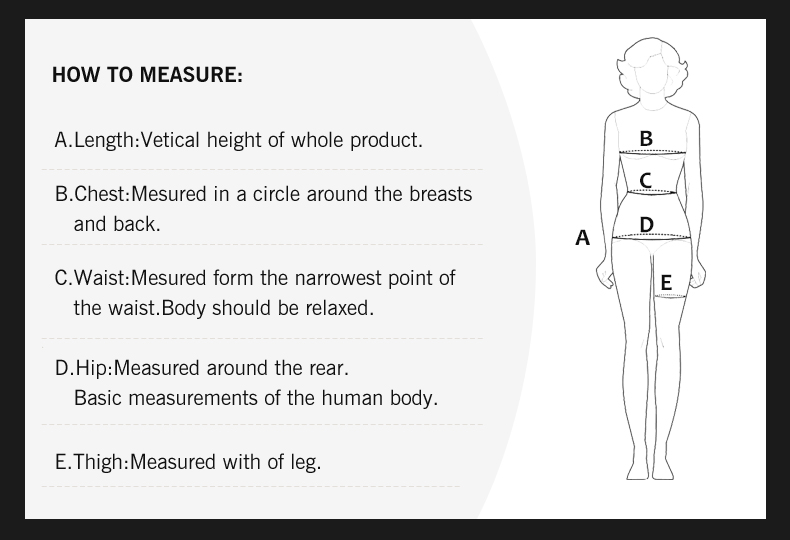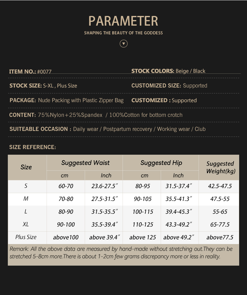 Remark: All the above data are measured by hand-made without stretching out.They can be stretched 5-8cm more.There is about 1-2cm few grams discrepancy more or less in reality. The waist is measured with the external locking hook.