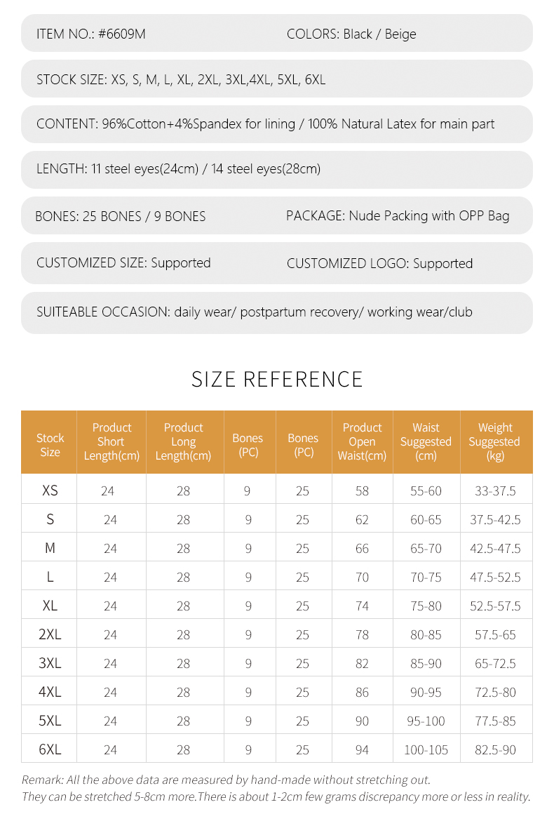 Remark: All the above data are measured by hand-made without stretching out.They can be stretched 5-8cm more.There is about 1-2cm discrepancy more or less in reality.