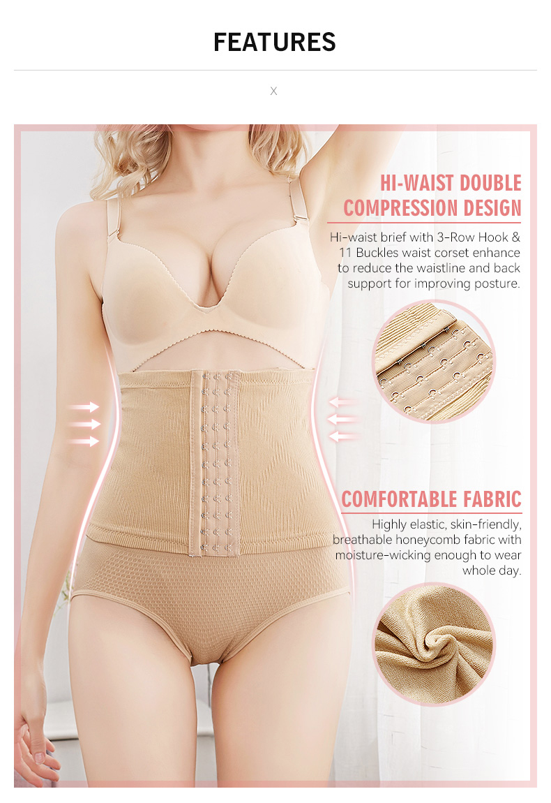 1. Hi-Waist Double Compression Design: hi-waist brief with 3-Row Hook & 11 Buckles waist corset enhance to reduce the waistline and back support for improving posture